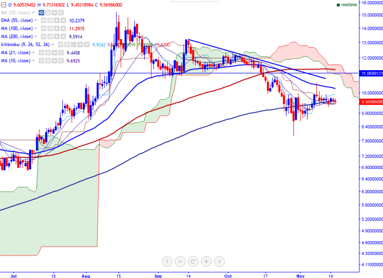 Major resistance is seen at USDT9.91 (daily Tenken-Sen) and any break above targets USDT10.26 (55- day EMA)/USDT11.30 (100- day MA). Short term support is around USDT9.57 (200 –day MA) and any break below targets USDT8.64 (Nov 11th, 2016 low) /USDT8 (Oct 29th, 2016 low)/USDT6.70 (7th Jul low).