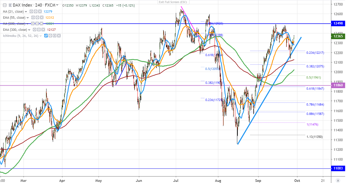 DAX recovered slightly after a more than 300 points dip from high 12491 made on Sep 13th, 2019. German economic data which has been released shows that the economy is in contraction. German manufacturing PMI came at 41.4 much less than 43.5 in Jul while the IFO index slightly positive at 94.6 compared to 94.3 in the previous month. It hits an intraday high of 12372 and is currently trading around 12365.
