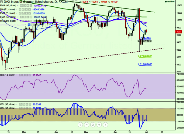 - DAX30 should close above 9860 for further bullishness. Any break above 9860 will take the index till 9940 (90 day EMA)/10084 (200 day MA)/10300.