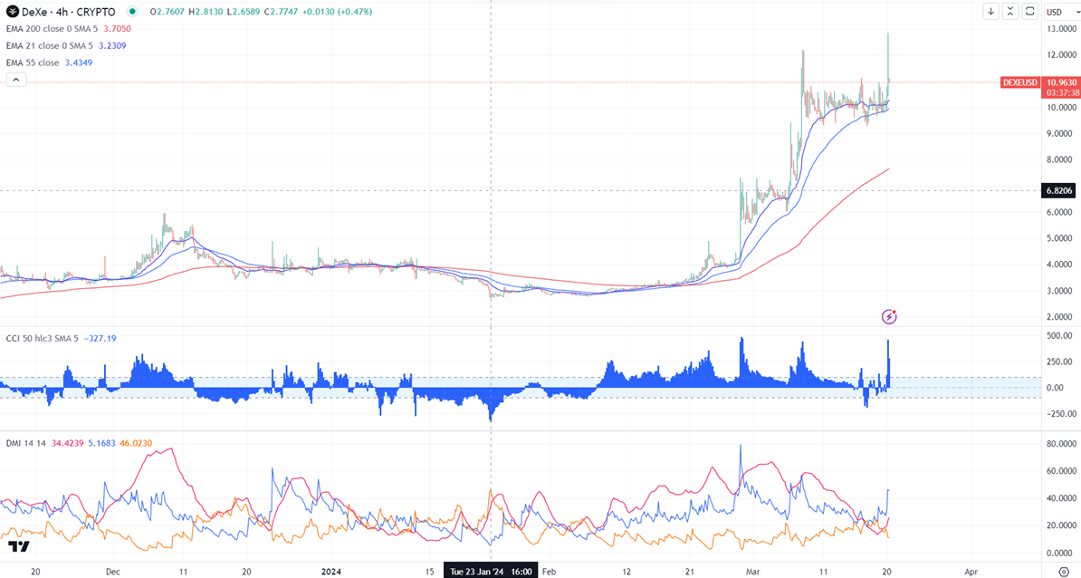 DEXEUSD surged more than 35% in the past two days. It holds above the short-term (21 and 55 EMA) and above the long-term moving average. It hit a high of $12.84 and is currently trading around $0.11.02.