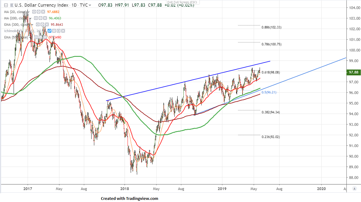 DXY has halted its 10- day on winning streak and shown a minor decline from high of 98.37. The index made a low of 97.03 on May 13th 2019 and jumped more than 130 pips from that level. It is currently trading around 97.86.