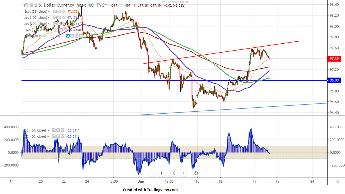 US Dollar Index -Intra day Trend weak. US Dollar index is trading slightly weak after recovering till 97.60 level.The near term intraday trend line resistance is around 97.65 and violation above targets 98/98.40.It is currently trading around 97.43.