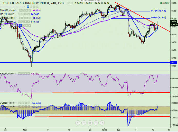 - US dollar index has broken major trend line resistance at 94.60 and jumped till 94.72. It is currently trading at 94.71.