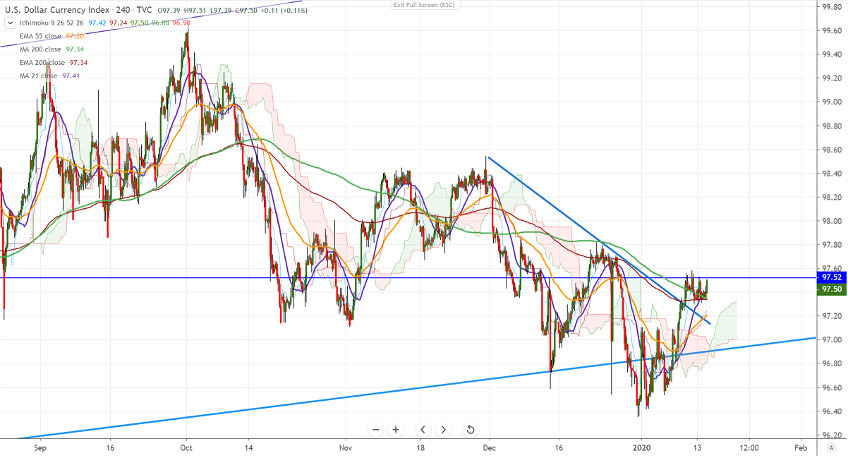 DXY is trading in a narrow range between 97.58 and 97.30 for the past 3 trading days. The minor jump in us US dollar index was due to strong USDJPY which constitutes 13.5%. It hits a high of 97.47 at the time of writing and is currently trading around 97.45.