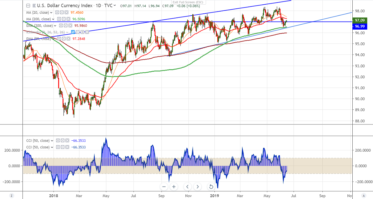 The index upside might be capped at 97.25 (50- day MA) and 97.45 (20- day MA)/97.66 (61.8% Fib). Any break above 97.66 targets 98.33 high made on Apr 26th 2019.6.14