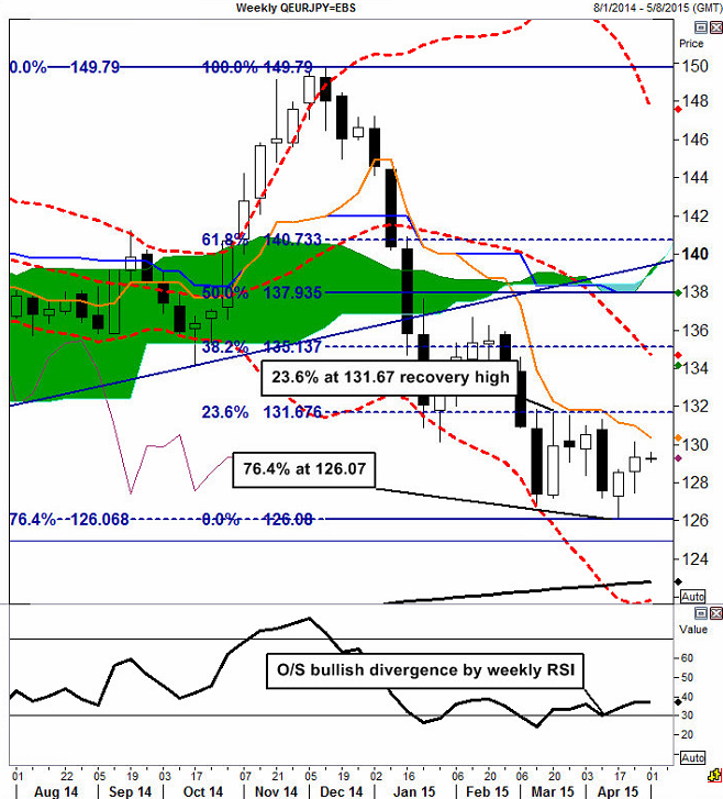 - Rebound likely to be slowed by cloud base & 50-DMA at 130.43/57, with weekly Tenkan at 130.34