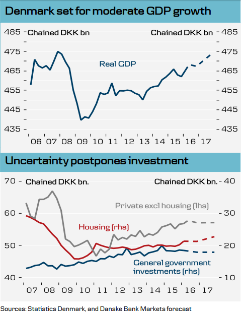 The Danish economy, in the first quarter, had surprised on the upside with GDP growth of 0.5 percent q/q after a disappointing H2 2015. Denmark’s tentative economic recovery could be derailed, wiping out hopes of a more than 1 percent growth in output next year, said Danske Bank in a report.