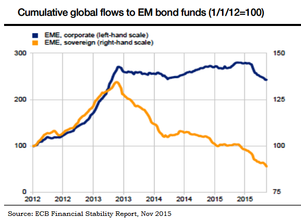 However economic stabilisation may be enough to lift cheaply valued EM assets. Volatility in EMs assets may stay high going into the new year, with allocations now slightly below their 2008-15 average, both for bonds and equities. In some cases, however, like EM corporate bonds, foreign allocations have only slightly retreated from the 2009-13 boom.