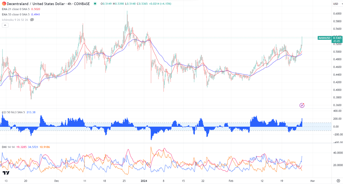 MANAUSD surged more than 15% in the past five days. The pair holds above the short-term (21 and 55 EMA) and above the long-term moving average. It hit a high of $0.5398 and is currently trading around $0.5373.