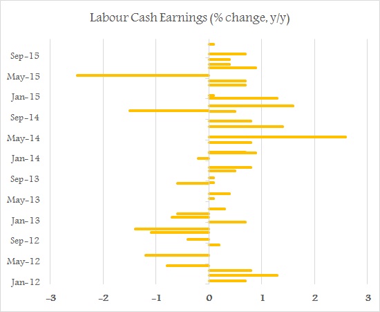 Labour cash earnings reported wages only edged up by 0.1% in December, compared to level a year ago. So economists are posing a serious question - if economy is growing just about 1.6% y/y and inflation is hovering at near zero level, why should companies pay higher wages, more so for firms, focused into domestic market, who are not major beneficiaries of weaker Yen. Bank of Japan's (BOJ) selective buying into equities, are not large enough to compensate corporations to increase wages.