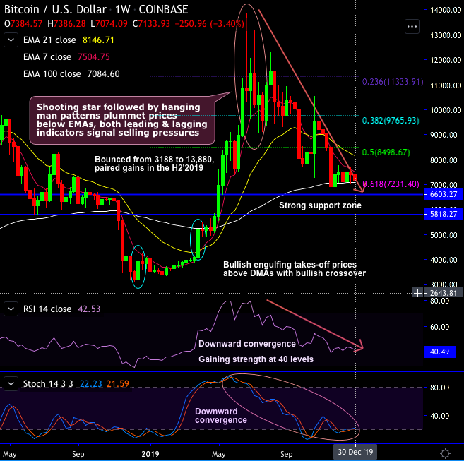 However, the bulls have not sustained the peaks at the end of June. Thereafter, bears have taken back the drivers’ seat to plunge the price the recent $6,430 levels, currently, trading at $7,141 levels. The H2 has seen the longs unfolding their positions to pave a way for bears with 53% price drops and H1 has gained about 315%, overall, bitcoin price has gained 113% in aggregate in 2019.