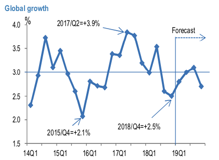 Although the economic growth is expected to slow down towards the end of this year, many economists continue to expect that the US and the global economic growth will remain above potential growth rates and the global growth bottomed in 4Q last year (refer above chart). Elsewhere, the prospect for sustained private capital outflows from CHF suffered a setback due to the protracted cyclical slowdown in the Euro area and the fading prospect for the ECB to begin to normalize policy over any reasonable timeframe.