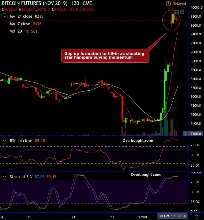 The CME BTC Futures (BTCX2019) has created a gap up pattern which is expected to be filled-in. Both momentum oscillators (RSI & Stochastic curves) are also indicating the overbought pressures (refer 1st chart for 2H chart). As a result, the sharp shooting star pattern has occurred at $9,630 levels that hampered the previous buying interests for now.