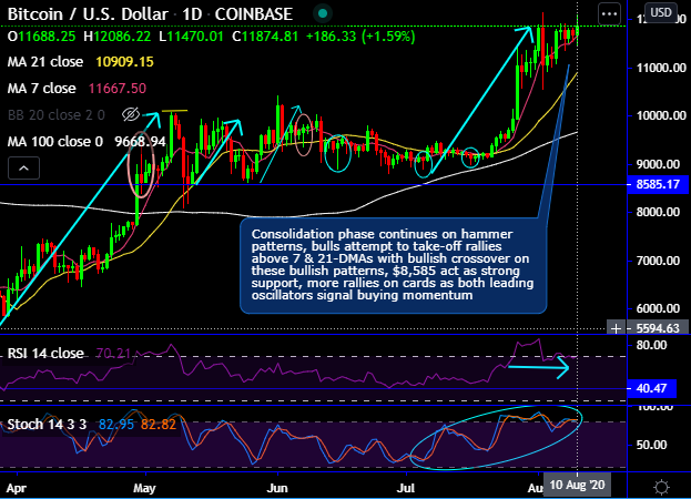 Bitcoin price action (BTCUSD at Coinbase) has been commendable since Covid19 saga, as it rebounds above $12k mark. Bulls are roaring on the verge of 1-year highs after decisive breakout of long-lasting range with the stern bullish candle on 27th (refer daily chart), technically, both leading & lagging indicators are also in line with the prevailing upswings.
