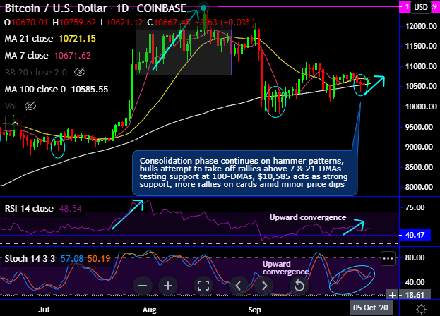 Technically, the consolidation phase continues on hammer patterns, bulls attempt to take-off rallies above 7 & 21-DMAs testing support at 100-DMAs, $10,585 acts as the strong support. For now, more rallies are the on cards amid the minor price dips.