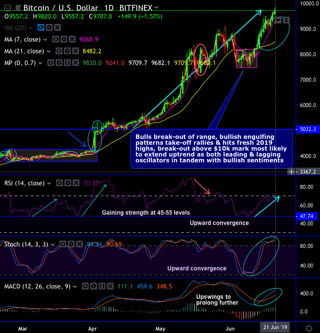 Year-2019 has been constructive Bitcoin prices so far, it has been spiking constantly higher from the last couple of weeks, rose from the lows of $3,215 levels to the recent highs of $9,820 levels which is the 2019 highs (i.e. almost more than 120% in this year so far). We are now on the verge of hitting multi-months highs if it breaks-out $10k mark.