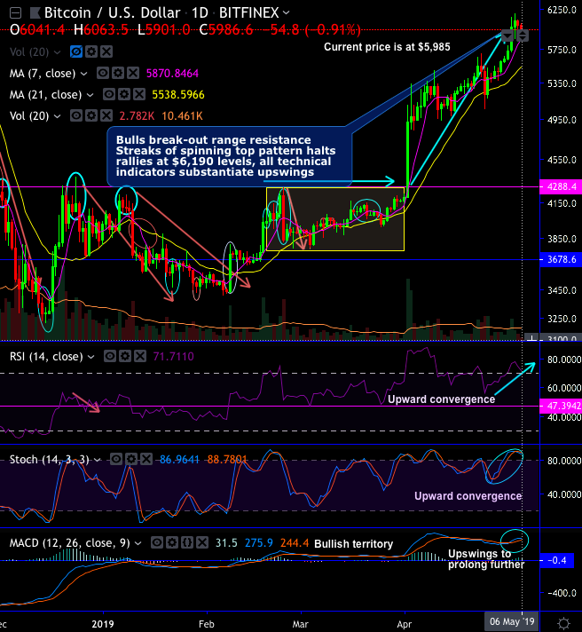 The rallies are now halted at $6,190 levels (i.e. 6-wk highs) upon spinning top pattern, while all technical indicators still substantiate upswings.