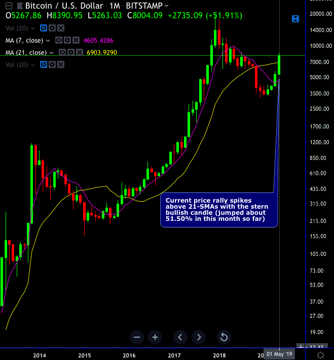 Bitcoin (BTC): The pioneer crypto (Bitcoin) surged by 51.5% to fresh Year-To-Date highs of $8,020, the current price rally of BTCUSD spikes above 21-SMAs with the stern bullish candle (jumped about 51.50% in this month so far).