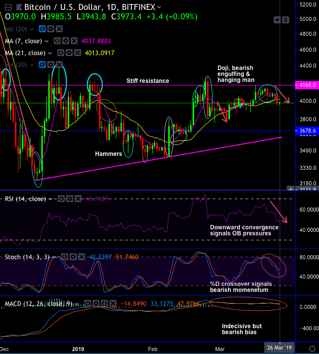 Technically, after BTCUSD has shown failure swings at stiff resistance of $4,168 levels, the pair has slid below 21-DMAs again (and thereby, $4k mark). But, the bulls and bears continue to wage an extended war between the tight range of $3,970 - $4000 psychological price levels, the majority of the crypto market experienced middling performance with a few select altcoin markets surging strongly. The pair has formed doji, bearish engulfing & hanging man at $4,073, $4,044 and $4,127.28 levels respectively.