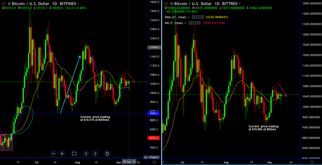BTCUSD at Bitfinex and BTCUSD at Bittrex: Please be noted that the BTC pricing against the dollar at the same two different exchanges, BTCUSD at Bitfinex and BTCUSD at Bittrex. There exists a disparity in their respective prices $10,515 at Bitfinex and $10,460 at Bittrex. Thereby, buying Bitcoin on the Bittrex exchange with USD and transferring the bitcoin and converting it back into USD on Bitfinex likely to derive a profit of just over 0.525%.