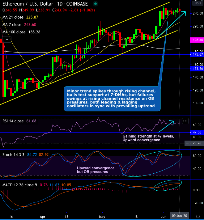 Technically, the minor trend spikes through rising channel, bulls test support at 7-DMAs. But failures swings at rising channel resistance on overbought pressures, both leading & lagging oscillators are also in sync with the prevailing uptrend (refer daily chart).