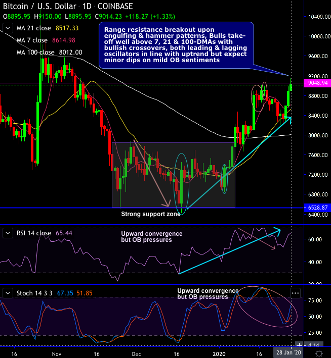 Bitcoin’s price (BTCUSD) has been continuing further its two day’s rallies (i.e. shy above 9%), while the overbought sentiment paused BTCUSD rallies above $9k levels. Despite vigorous price slumps from the last couple of days, the bitcoin price managed to bounce back and reclaim $9k upon hammer pattern at $8,427.26 levels (i.e. testing support at around 21-DMAs).
