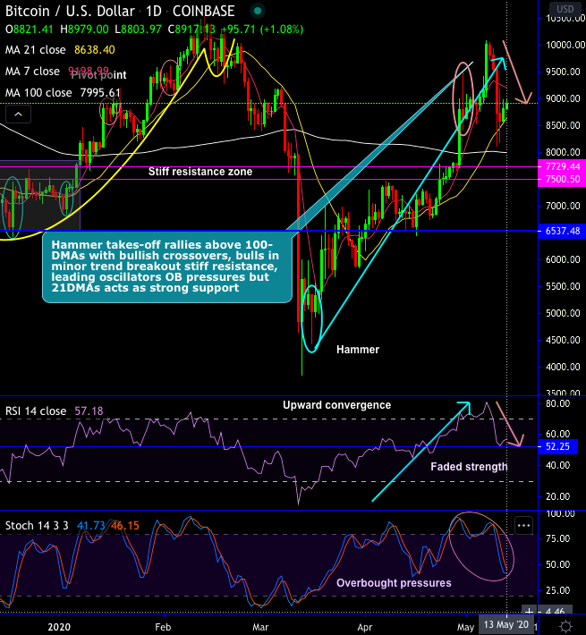 Technically, hammer takes-off rallies above 100-DMAs with bullish crossovers, bulls in minor trend breakout stiff resistance, leading oscillators OB pressures but 21DMAs acts as strong support. Since mid-March, BTC has spiked from $3,858 to the current $10,079 which is 160% rallies.