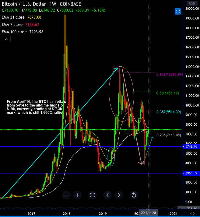 Technically, the pair (BTCUSD at Coinbase) has risen above 100-EMAs and retraced 23.6% Fibonacci levels of the Dec’2018 lows and all-time highs in Dec’2017. Please be noted that from April'16, the BTC has spiked from $414 to the all-time highs of $19k, currently, trading decisively at $7.5k levels, which is still a mammoth 1,660% rallies.