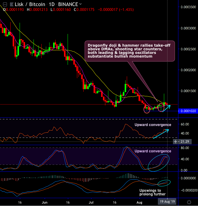 Technically, on daily plotting of LSKBTC hammer & dragonfly doji pattern candlesticks have occurred at 0.0001105 and 0.0001148 take-off rallies above DMAs, whereas shooting star counters, while both leading and lagging oscillators substantiate short-term bullish momentum.