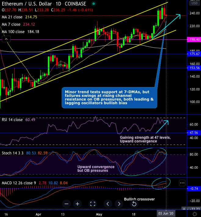 ETHUSD’s consolidation phase has been constructive, it has seen rallies of 12.27% in May’20. The pair is currently trading just under 4.8% from the channel resistance at it is trading at $236.70 levels. ETH seems to have catalysed the recent bullishness in the crypto-space, as it continued last week’s uptrend along with Bitcoin and most other major altcoins.