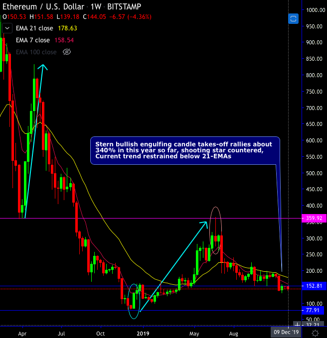 Although the minor trend goes in sloping channel, the rallies spike above DMAs upon stern bullish engulfing candle at $129.61 levels, consequently, the price of ether against dollar has surged more than 340% in 2019 so far. But the minor trend tests sloping channel support, any bounce back above 21-DMAs signal renewed upside traction.