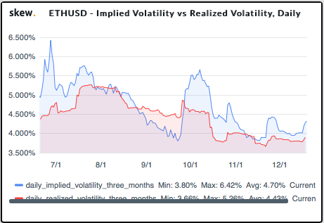ETH RVs, as you could observe from the above chart, has been chasing downwards from the last 6 months or so, but for now, reversed and going upwards. Also be noted that the downward shift of the underlying price which is in sync with the Vols curves. But for those who are sceptical and argue about the further downtrend continuation on account of the correlation with the IV and RV cuvres, because it seemed tide in IV curve in the month of October and in mid-November but the price failed to bounce.