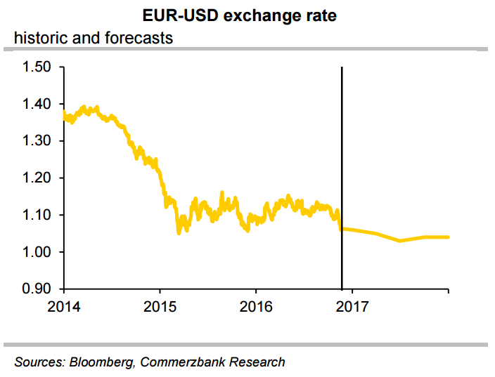 Fed will keep hiking interest rates whereas the ECB will stick to its expansionary stance. With Fed and ECB monetary policies diverging further, EUR/USD is likely to remain subdued. By end-2017 the ECB will be forced to gradually stop buying bonds as it will gradually run out of eligible assets. This should support the euro against the US dollar by the end of 2017.