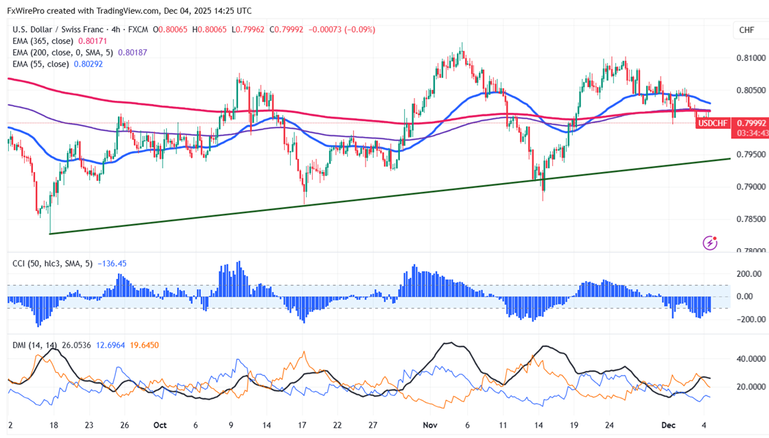 The pair is trading below the 55-EMA, the 200-EMA, and the 365-EMA on the 4-hour chart, indicating a bearish trend. The immediate resistance is at 0.8020; any break above targets 0.8060/0.8105/0.8150/0.82180.