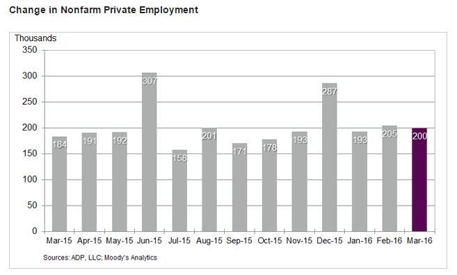 - Non-farm private sector employment grew at 200,000 in March. In February payroll grew by 205,000.