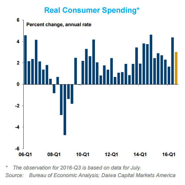 Consumer spending in the U.S. accounts for 70 percent of economic activity and is the main contributor to power overall growth in the second half of the year. Data released by the U.S. Commerce Department on Monday showed that consumer spending rose for the fourth straight month in July, a sign that domestic consumption could continue to drive U.S. economic growth over the second half of the year.