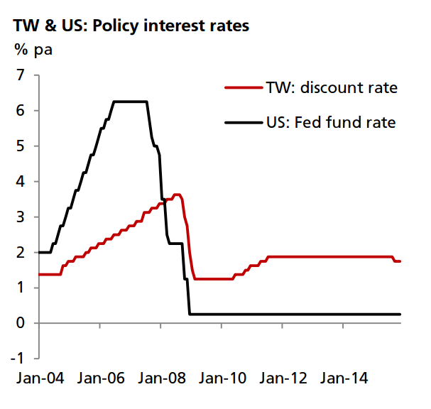 It was true that the CBC followed the Fed to hike rates during the 2004-07 cycle. Back then Taiwan's economic growth picked up along with rising demand from the US. Today's situation is different, as a slowing Chinese economy offsets the US's recovery and weighs on Taiwan's exports. In fact, the correlation with US growth cycle has weakened in recent years, and policy decoupling has taken place. The CBC continued to hike rates in 2007-08 when the Fed cut rates in the wake of the subprime crisis. The CBC also embarked a modest tightening cycle in 2010-11, even when the Fed continued to pursue quantitative easing.