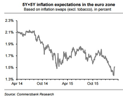 "The ECB to revise down its 2016 and 2017 inflation forecasts from +1.0% and +1.6% projected in December to +0.4% and +1.4%, respectively. This compares with our revised forecast that inflation is likely to average +0.1% this year and +1.0% next", says Barclays in a research report.