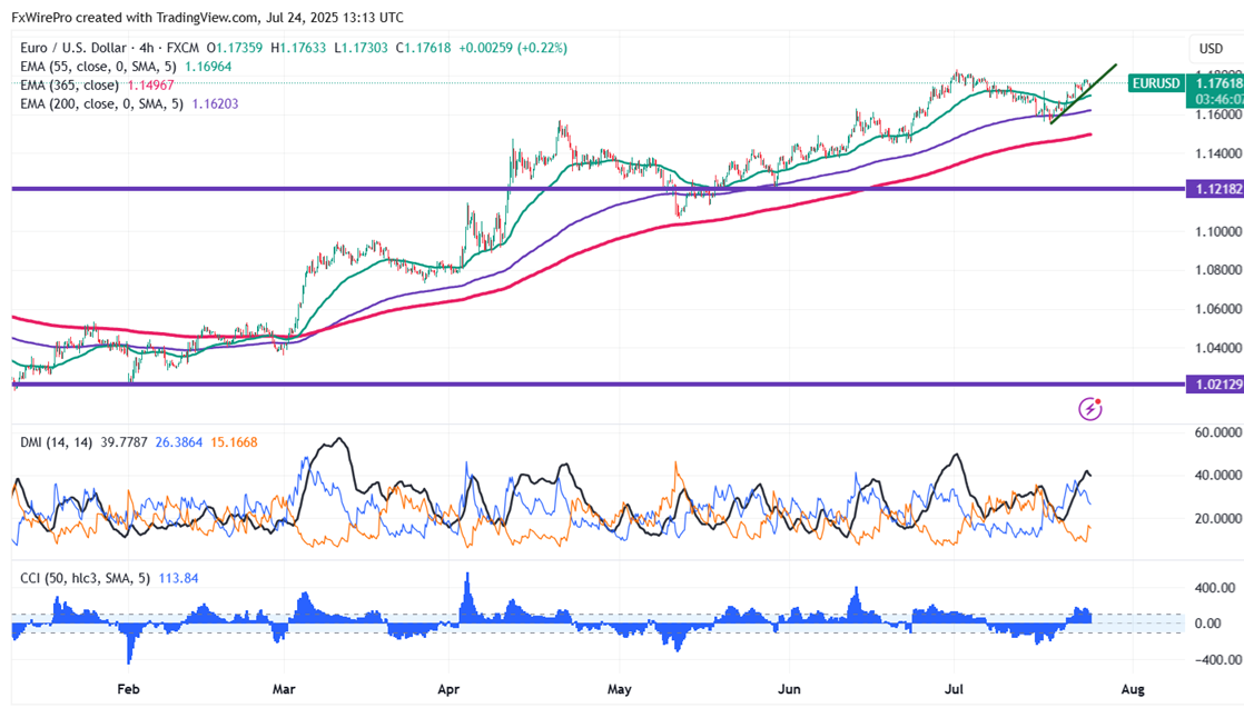 The pair is holding above the 55 EMA,above 200 EMA, and 365 EMA in the 4 -hour chart. Near-term resistance is seen at 1.1780, a break above this may push the pair to targets of 1.1800/1.1835/1.19090/1.1956/1.200. . On the downside, support is seen at 1.1700; any violation below will drag the pair to 1.1670/1.1600/1.155.
