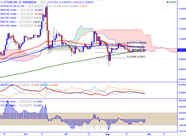 ETH/EUR is seen trading above on Monday after the plunge. The pair has slightly broken from 200 –day MA and declined till 9.612 (KRAKEN). It is currently trading at 9.84 at the time of writing.