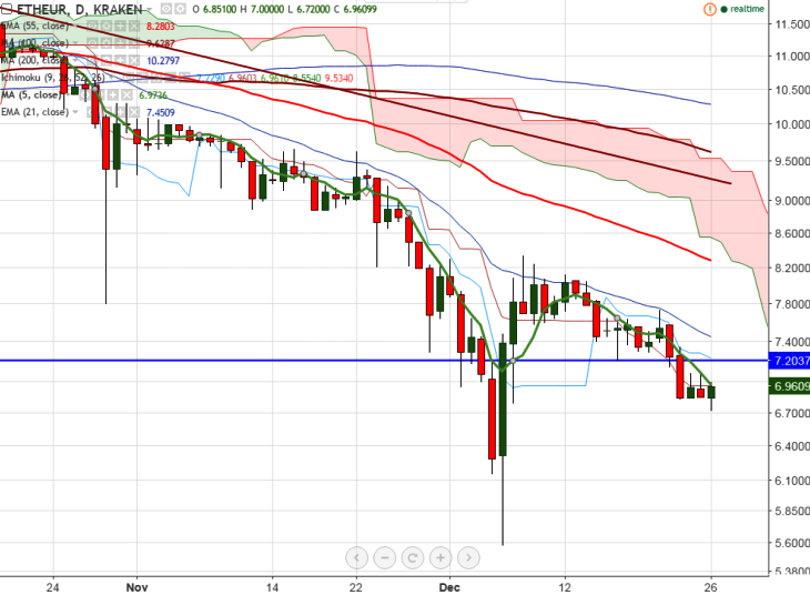 ETH/EUR is seen trading slightly above on Monday. The pair has broken major support at 7.20 levels and declined till 6.72 levels (KRAKEN). It is currently trading around 6.96 levels at the time of writing.