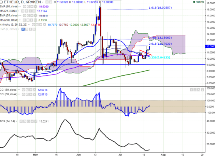 ETH/EUR is seen trading well above on Friday. The pair has recovered after making a low of 10.69 levels (KRAKEN). It is currently trading at 12.04 at the time of writing.
