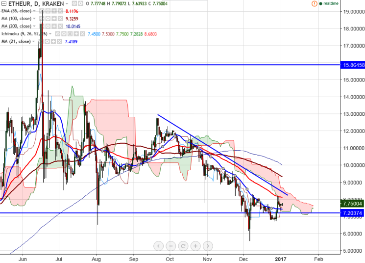 ETH/EUR is seen trading slightly below on Monday. The pair breaks the minor resistance at 21- day MA and jumped till 8.139 (KRAKEN). It is currently trading around 7.75 at the time of writing.