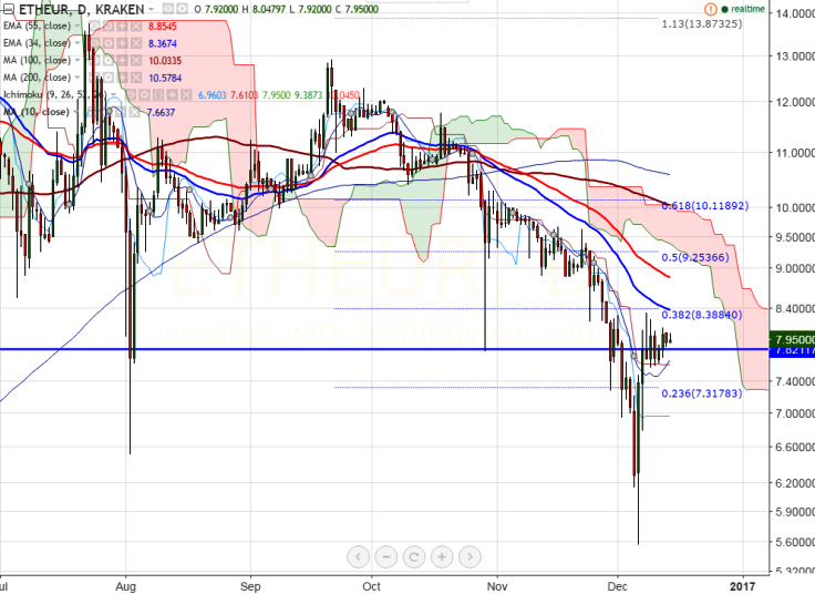 ETH/EUR is seen trading below in red on Wednesday. The pair is trading in a narrow range between 8.33 and 7.597 for the past three trading sessions (KRAKEN). It has jumped till 7.9300 at the time of writing. It is currently trading around 7.91.