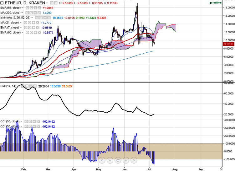 Long-term trend remains bullish. Short term seems to be bearish. In daily chart, ETH/EUR is struggling to break above 7 days EMA .Any further bullishness only above that level.