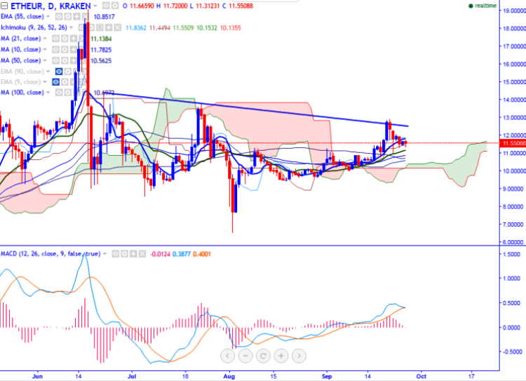 ETH/EUR is seen trading below in red on Monday. The pair has slightly retreated after making a high of 11.72 levels (KRAKEN). It is currently trading around11.52 at the time of writing.