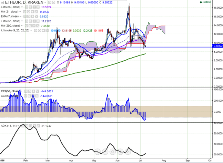 ETH/EUR is seen struggling to rise above 10 on Friday. The pair has slightly recovered after making a low of 8.89 levels (KRAKEN) yesterday. It is currently trading at 9.30 at the time of writing.