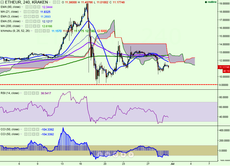 ETH/EUR is seen trading in red on Thursday. The pair has slightly recovered after making a low of 10.29 levels (KRAKEN). It is currently trading at 11.30 at the time of writing. The pair has jumped till 11.78 and started to declined from that level.