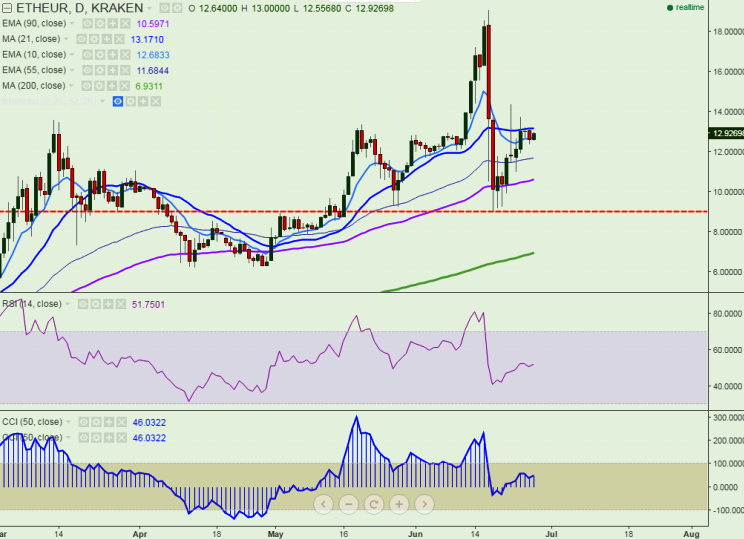 Long-term trend remains to be bullish. In daily chart ETH/EUR is trading well above 10 day EMA. So slight jump till 13.75 (Jun 24th high) is possible.