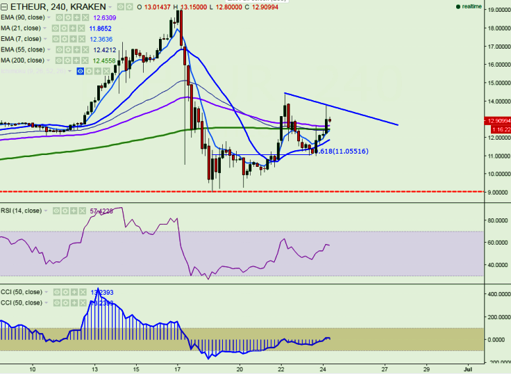 Long-term trend remains to be bullish. In 4hour chart ETH/EUR is trading well above 90 4H MA. So jump till 14.40/15.40 is possible.